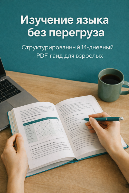 Практический PDF-гайд для взрослых, изучающих иностранный язык спокойно и устойчиво. Создан для тех, кому важно изучение языка без перегруза, давления и чувства вины